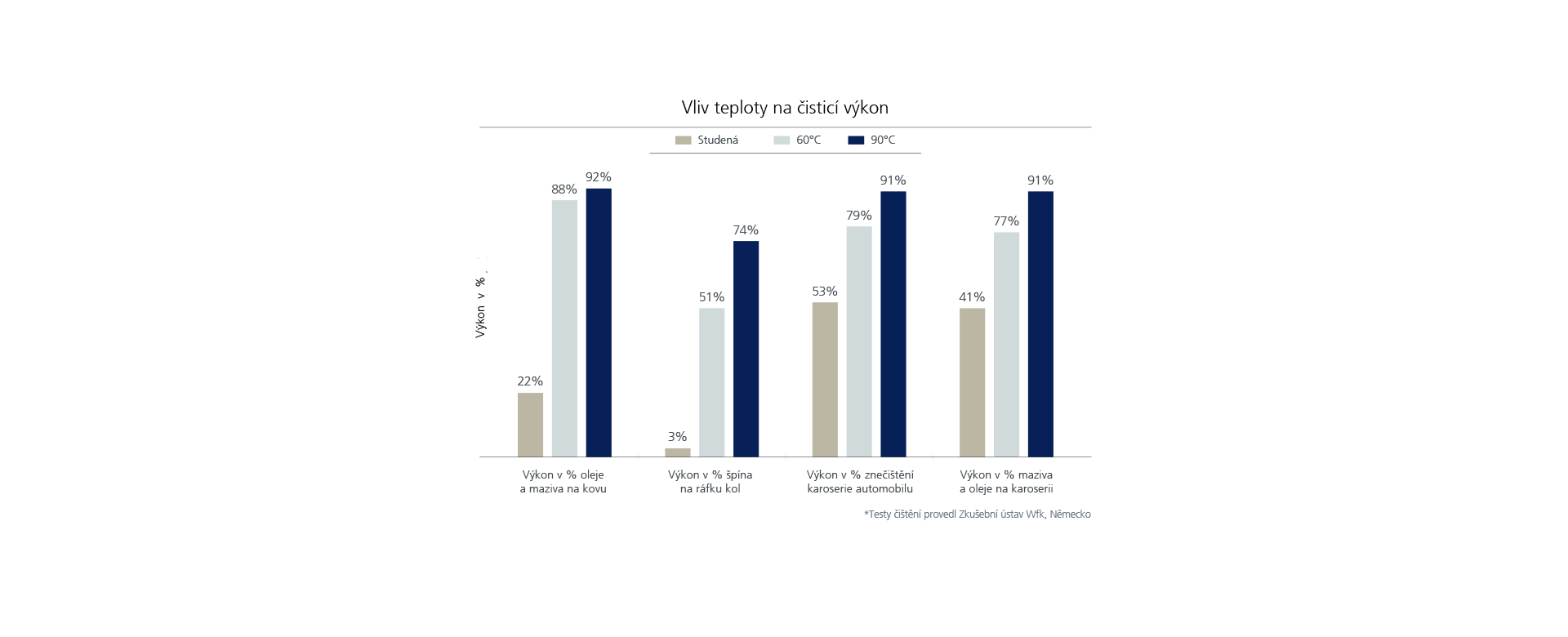 Ve spolupráci s institutem wfk – Cleaning Technology Institute jsme provedli testy porovnávající vysokotlaké mytí horkou a studenou vodou a zjistili jsme, že ve všech aplikacích se doba čištění horkou vodou zkrátila v průměru o 40 %. V některých případech, například tam, kde se vyskytovala mastnota, tuky a oleje, bylo čištění horkou vodou čtyřikrát účinnější než čištění studenou vodou. Výsledkem bylo zkrácení doby čištění o 75 %.