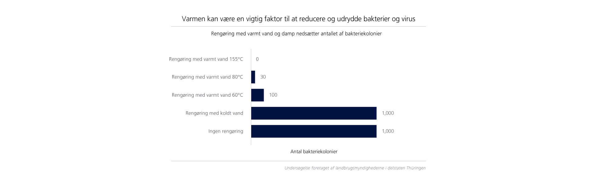 Varme er en vigtig faktor i bekæmpelsen af bakterier. Et studie udført af Thuringen State Office for Agriculture viste, at selvom rengøring med koldt vand ikke havde nogen indvirkning på bakterieniveauet, blev bakteriekolonierne reduceret med 90 %, når temperaturen blev hævet til 60°C. Ved 80°C blev bakteriekolonierne reduceret med 97 %, og ved 155°C blev de helt elimineret.