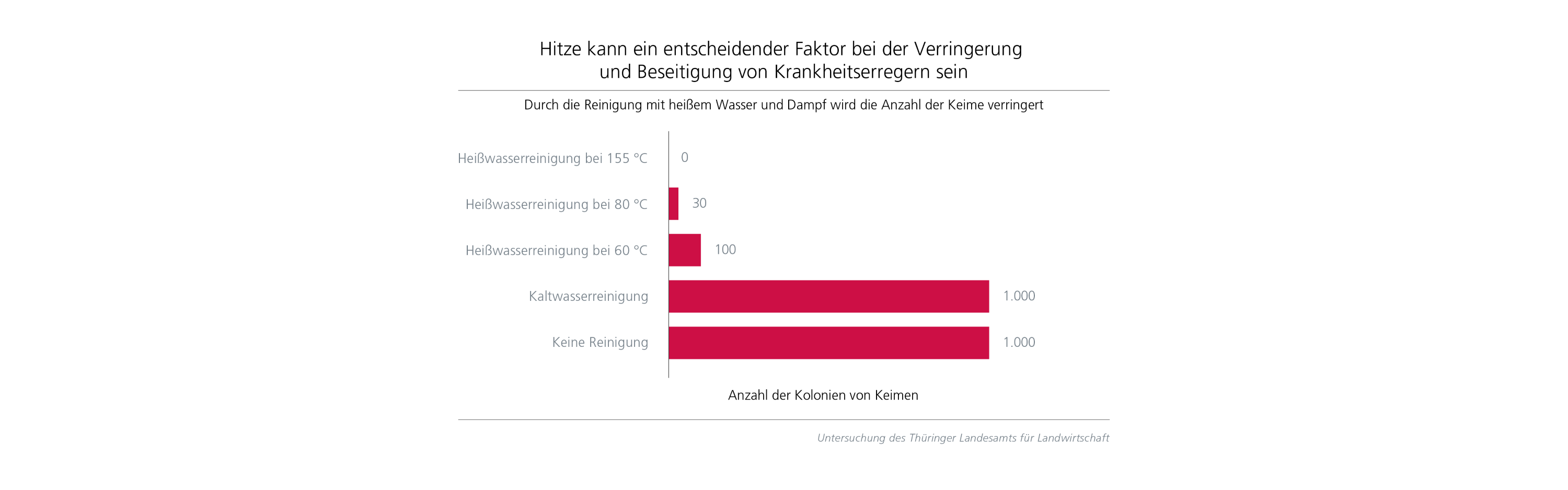 Hitze ist ein Schlüsselfaktor bei der Bekämpfung von Keimen. Eine Studie des Thüringer Landesamtes für Landwirtschaft ergab, dass die Reinigung mit kaltem Wasser keinen Einfluss auf die Keimzahl hatte, eine Erhöhung der Temperatur auf 60 °C jedoch die Anzahl der Bakterienkolonien um 90 % reduzierte. Bei 80 °C wurden die Bakterienkolonien um 97 % reduziert und bei 155 °C vollständig abgetötet.