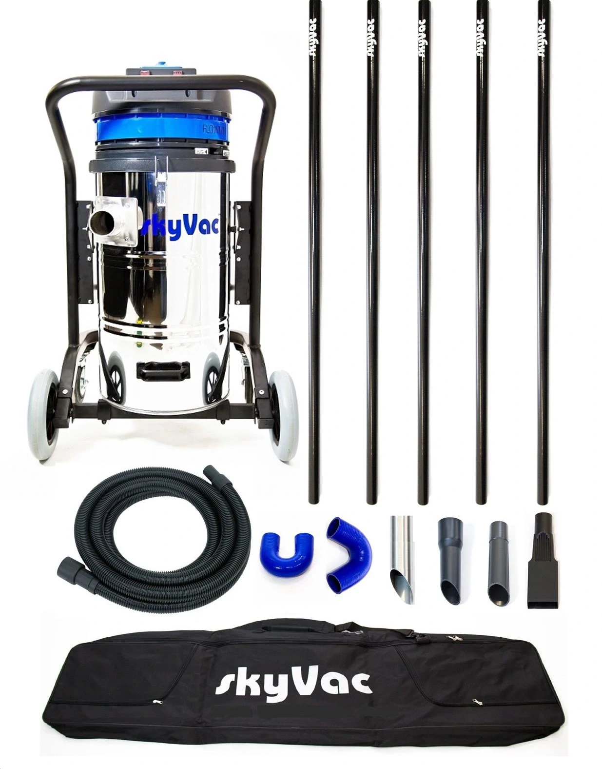 The Skyvac Industrial 85 quickly eats away at moss, mud and debris that builds up over time in gutters, making it ideal for heavy duty use on domestic and commercial properties, retail outlets, factories, schools, offices and hospitals. Removing the need for ladders, scaffolding and cherry pickers (which are time consuming and OH&S risks), the SkyVac gutter vacuum system allows work to be carried out at extreme heights by simply attaching the relevant poles and nozzles to the vacuum hose.