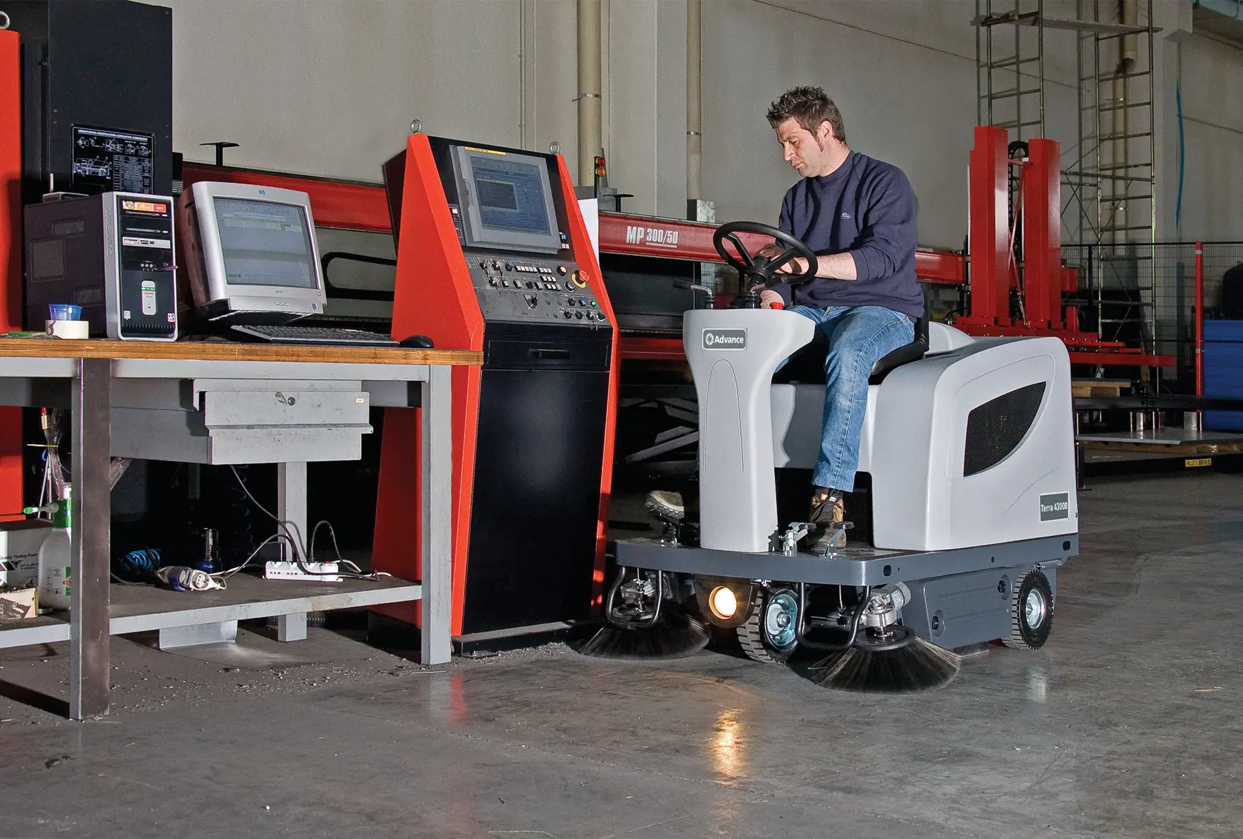 The Terra® 4300B / 4300BS compact rider sweeper covers up to 81,350 sq feet per hour, delivering increased productivity over walk-behind sweepers. The 4300B / 4300BS expertly sweeps both sides of a 48-inch aisle or hallway. It is designed for use both indoors and out, and on multiple surfaces, including hard floors, low-nap carpet and sidewalks.