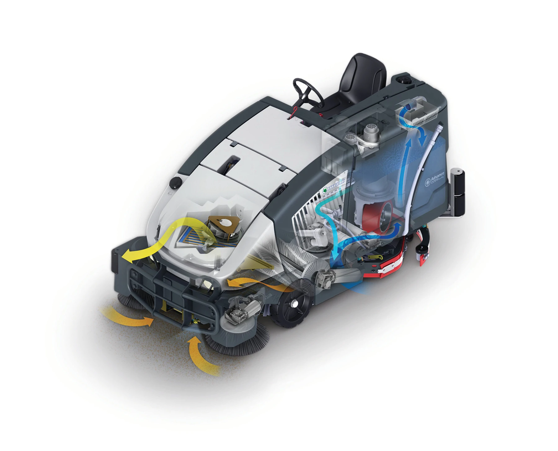 - Complete dry sweeping system with dual side brooms, powerful main broom, dust control system, and high capacity 7 ft 3 high-lift hopper system