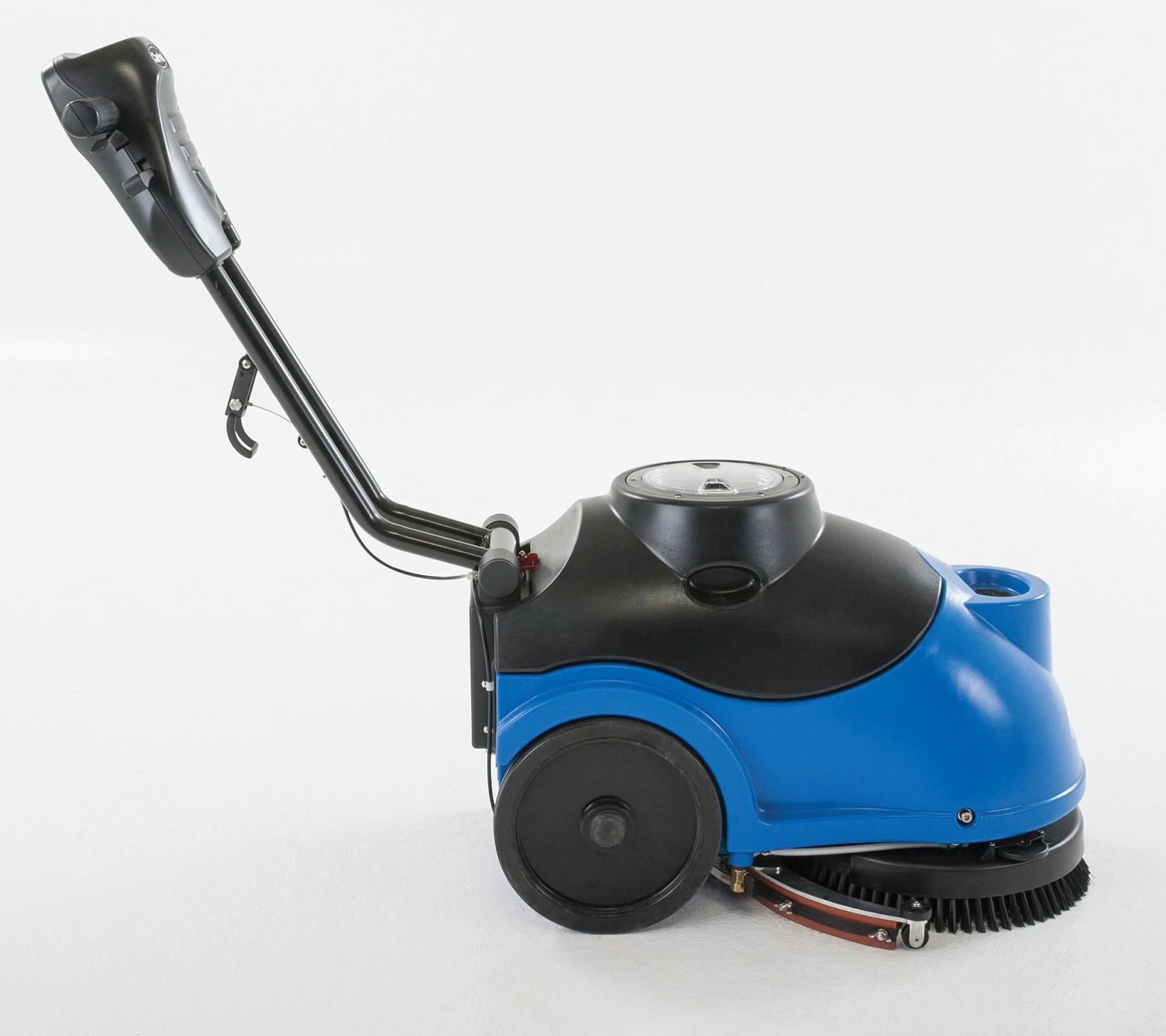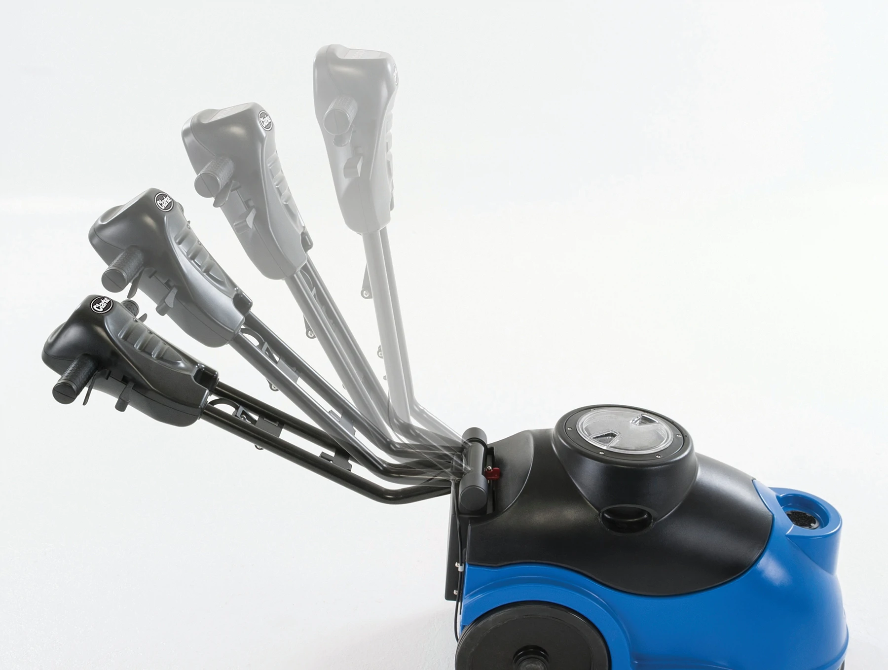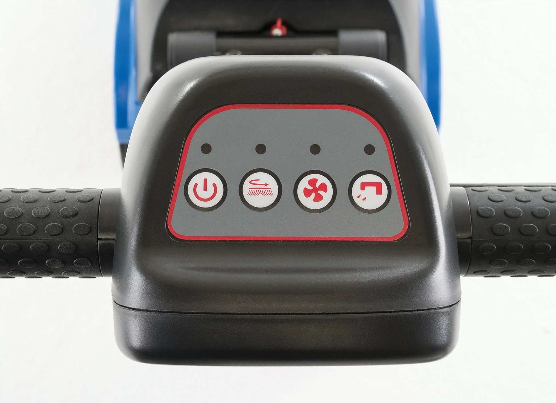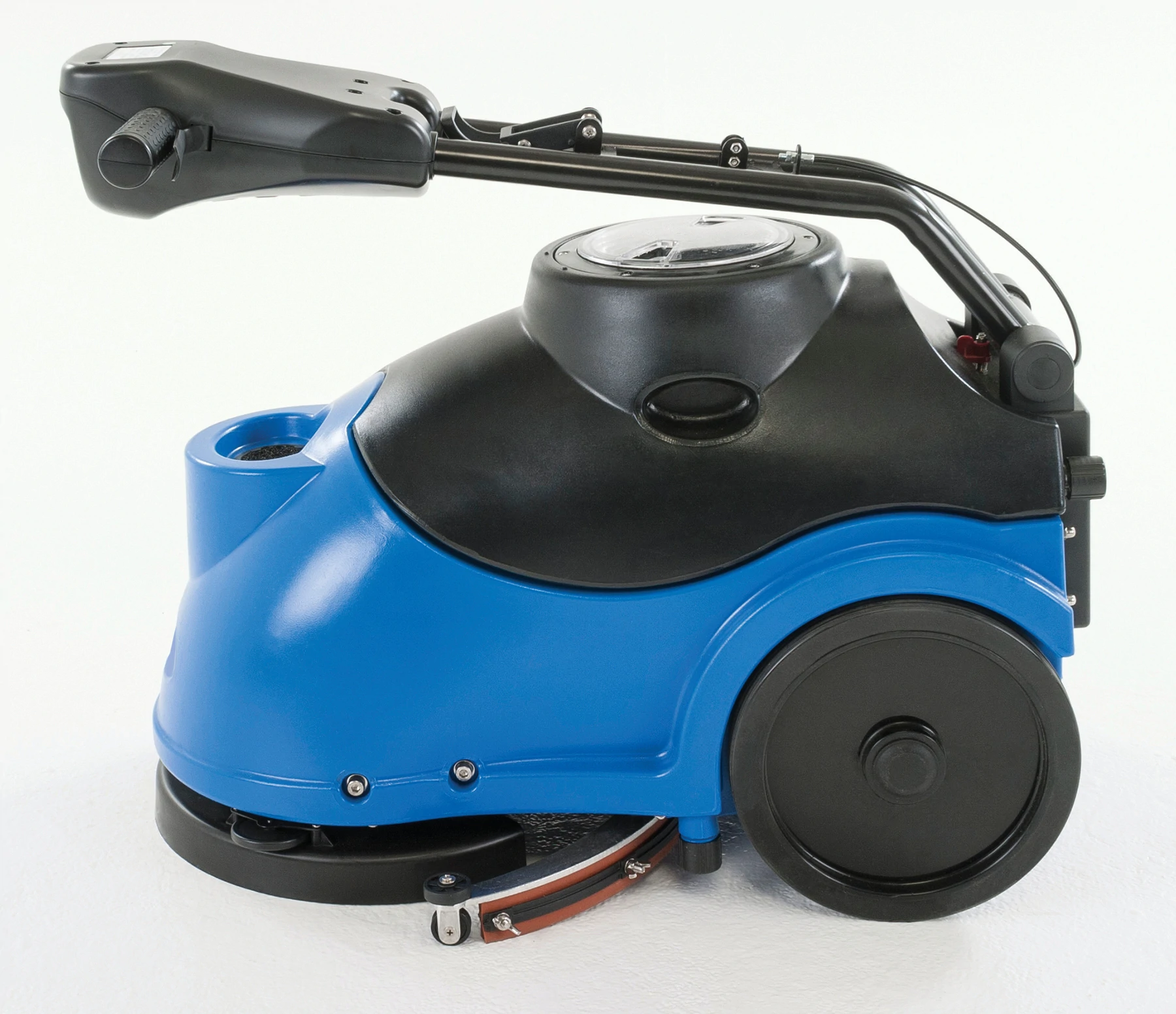 Fingertip controls are easy and intuitive to use Low-profile design cleans even tight, hard-to-reach spaces Onboard battery charger and auxiliary cable allow “away from home” charging Innovative, rounded squeegee helps ensure one-pass solution pickup Fold-down handle simplifies storage and transport 3.5-gallon cleaning solution and recovery tanks maximize scrubbing runs Lift-off recovery tank simplifies dumping