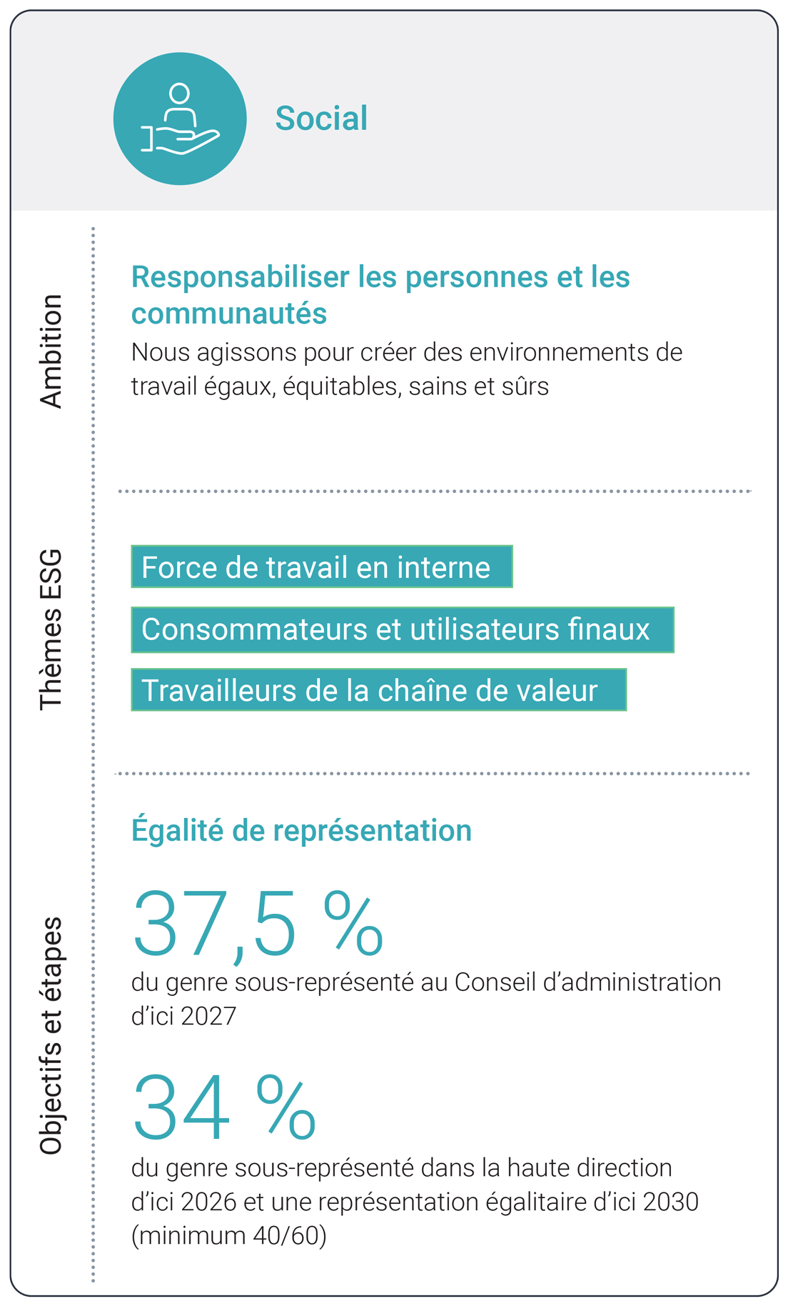 Le développement durable est ancré dans notre stratégie d’entreprise – et donc intégré dans toutes nos activités. Nous nous efforçons d’atteindre quatre priorités en matière de développement durable basées sur des sujets importants, les droits de l’homme fondamentaux et les Objectifs de développement durable (ODD) des Nations Unies.