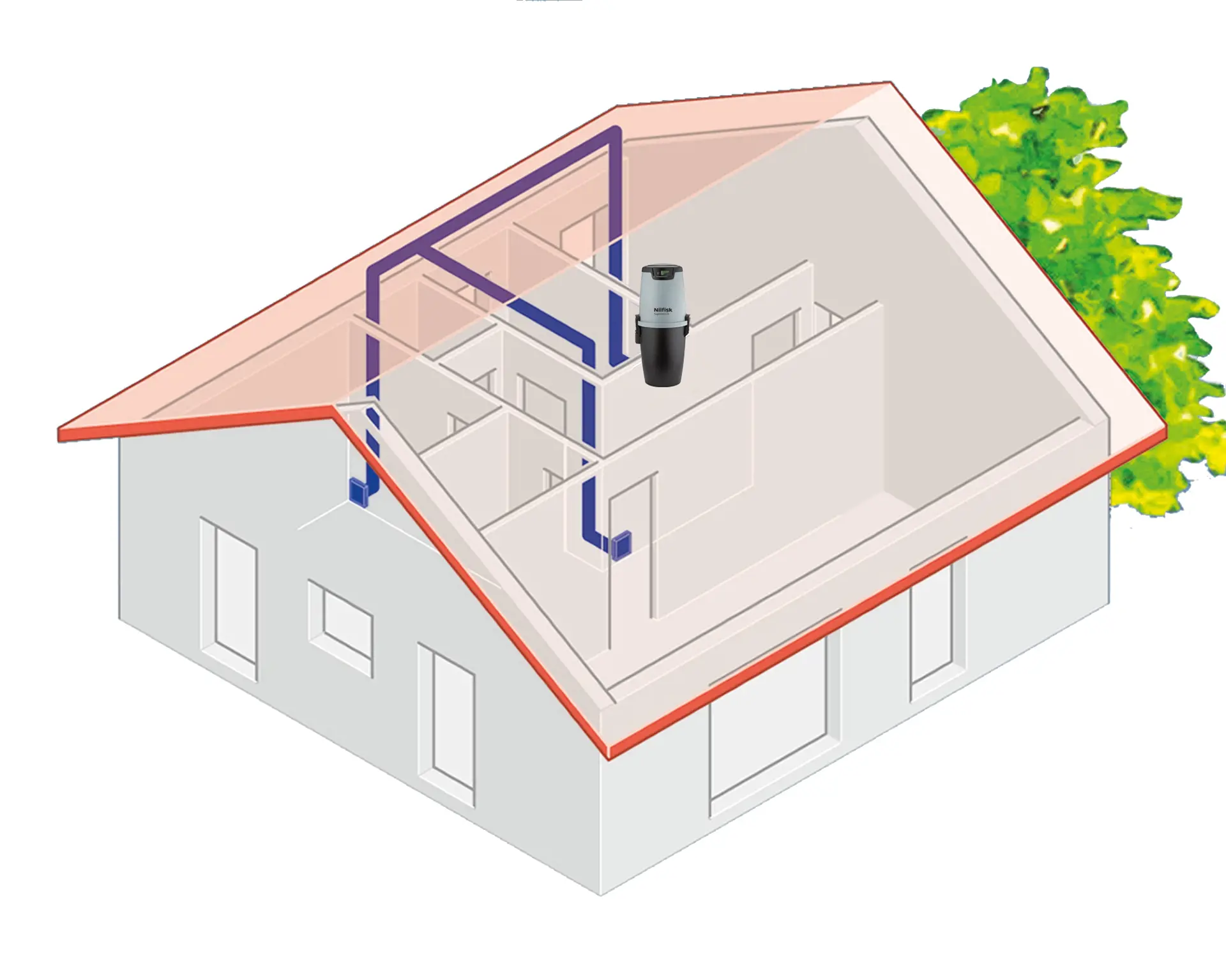 A central vacuum cleaner does just that. It is extremely quiet, odour free, lightweight and handy, turning a repetitive domestic chore into an agreeable easy-to-do job. With the central power unit (combined motor and dust container) stowed away on the loft, in the basement, or in some remote location where it bothers no one, it is out of the way, and the only thing you need to carry around, when vacuuming is the hose itself. A clever precaution against asthma, eczema and other allergies as all dust pick up is directed out of the rooms through the sealed tubes.