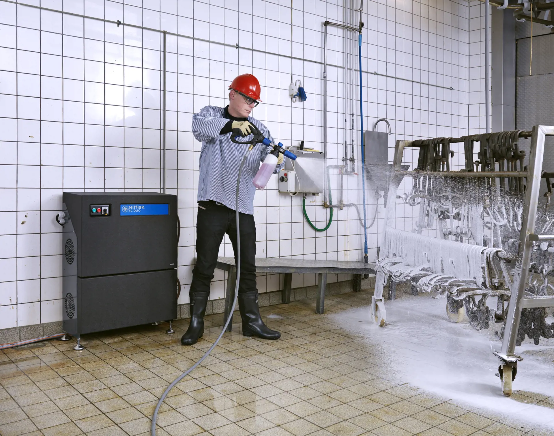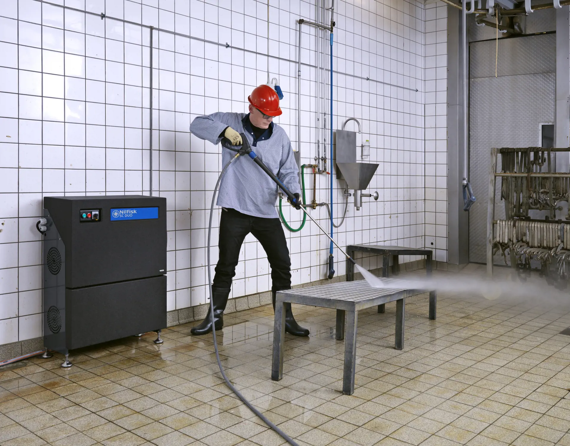 Designed for large cleaning tasks SC DUO 6P, 7P & 8P are ideal for agriculture with milking sheds, sties, and stables. Food and pharma industry with processing equipment, conveyors, and tanks. Shipping and industry with ship decks, bulkheads, and industrial equipment. Even oil and grease can be removed easily thanks to the hot water inlet..