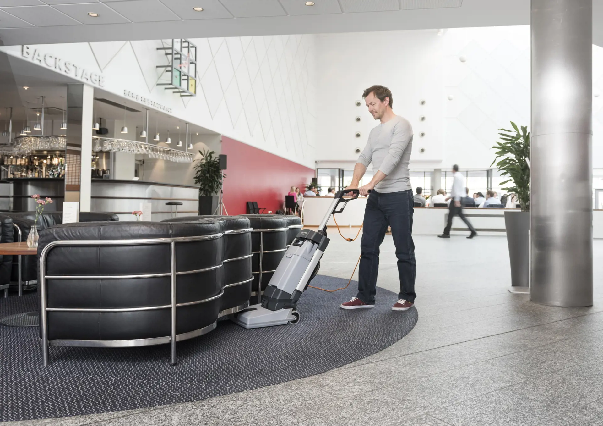 De Nilfisk SC100 is een compacte schrobzuigmachine voor de reiniging van krappe ruimten. Vergeleken met de handmatige reiniging met de traditionele mop is dit de snelste oplossing voor de reinigingsklus.