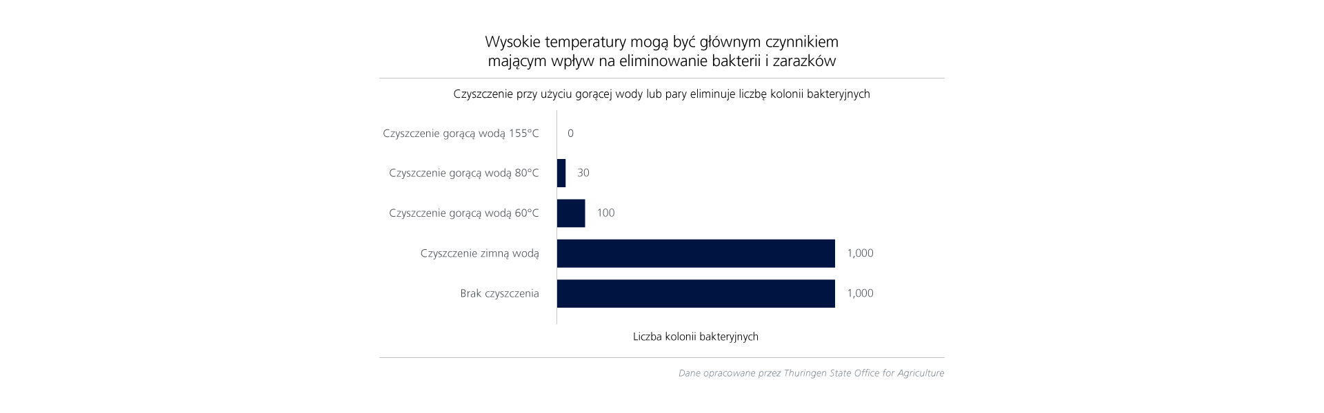 Wysoka temperatura jest kluczowym czynnikiem umożliwiającym zwalczanie bakterii. Badanie przeprowadzone przez Krajowy Urząd ds. Rolnictwa w Turyngii wykazało, że czyszczenie zimną wodą nie miało wpływu na liczbę bakterii, natomiast podniesienie temperatury do60˚C pozwoliło ograniczyć liczbę kolonii bakterii o 90%. W temperaturze 80˚C liczba kolonii bakterii spadła o 97%, a w temperaturze 155 ̊C bakterie zostały całkowicie wyeliminowane.